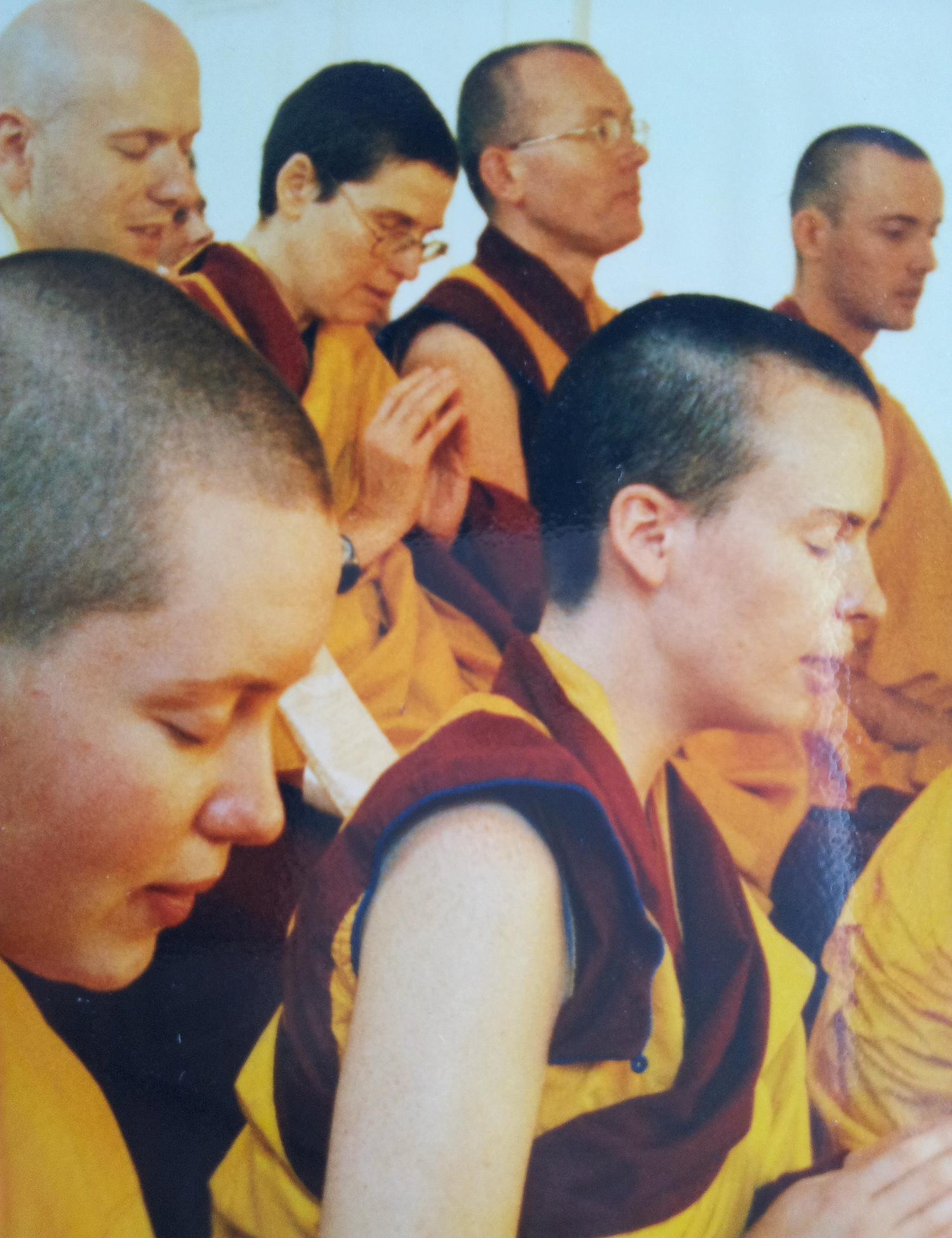 Five months of intense retreat in a quiet house in a Surrey village during 1998 convinced me that the methods of meditation that Geshe-la taught were invaluable and extraordinary; my personality had changed profoundly and irrevocably. I wanted to live in an NKT residential community in Britain to deepen my practice and find support like that I had received from the Sangha, the NKT Buddhist community, in Mexico. I stopped training as a counsellor and from 1998 to 2006 I lived within or very near an NKT centre with my children, depending entirely on British government social security benefits. I joined the Teacher Training Programme (TTP) and then, to fulfil my intention to promote these teachings for the rest of my life, requested ordination, scrawled on a slip of paper as, simply, the last on a list of study questions I’d sent my Resident Teacher, the teacher assigned by Geshe-la to my local NKT centre. Weeks passed. When I asked again he was in a hurry to leave for Italy and apologised for not having time to talk. He told me to “send an email to Manjushri Centre” to ask. Three weeks later, with only two weeks left to find ordination robes to wear as well as gifts and money for Geshe-la, I was given permission to ordain. I was told that my path to enlightenment would be even faster as being ordained I could concentrate on helping others. The only prerequisite was having the desire to ordain and my only preparation was the NKT monk from Mexico giving me a short whispered “transmission” of the commitments at an NKT Summer Festival, with a suggestion to keep these for a year “as if” I were ordained. I had done so, content. Ordaining, I would promise to abandon killing, stealing, sexual activity, lying, and taking intoxicants and would promise to practise contentment, reduce my desire for worldly pleasures, abandon engaging in meaningless activities, maintain the commitments of refuge (to Buddha and NKT Dharma and Sangha), and practise the three trainings of pure moral discipline, concentration, and wisdom. For the rest of my life.
